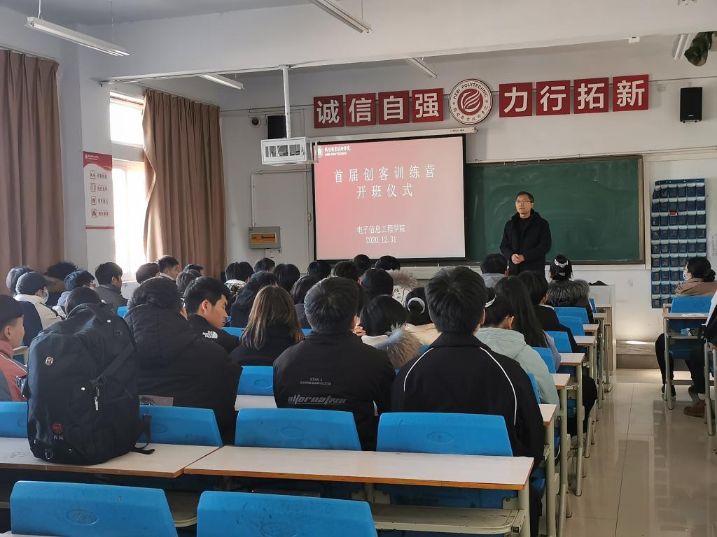 2020年12月31日中午,hahabet博弈首选在自强一号楼3612教室举办了首届创客训练营开班仪式。电子信息工程公司党总支副书记曹玉瑞、指导教师杨建强、王鹏宇、孙华、辅导员李甲甲和70多名训练营的同学们参加活动。